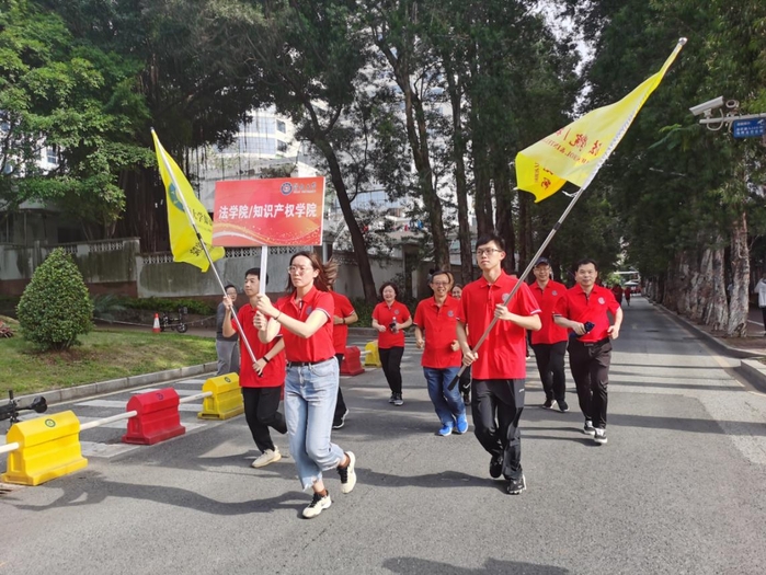 在“VSport”的旗帜下,老师们身穿红色运动服,排成五列纵队。他们精神饱满,斗志昂扬,金黄色的院旗随风飘扬,“暨南法学,勇创一流”的口号响彻校园。当大家经过主席台时,精心编排的口号在空中回荡,他们将公司的良好风貌展示给师生!