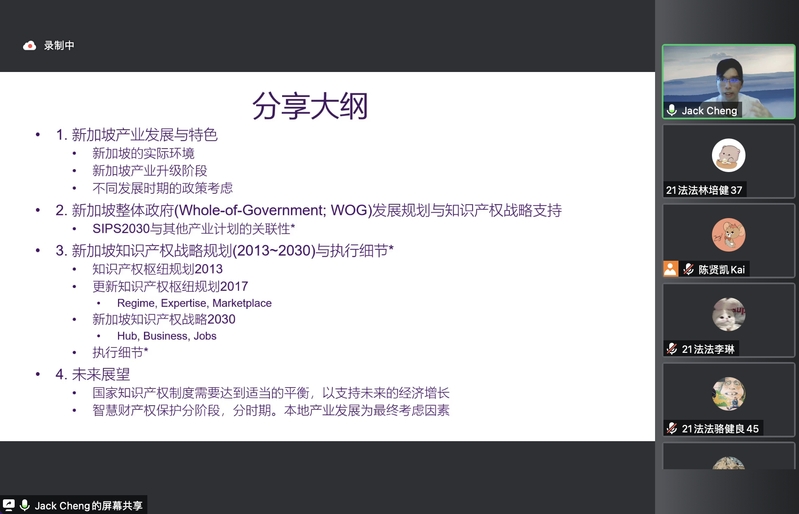 2022年3月19日下午,公司举办暨南法学论坛·名师讲坛第139期。受疫情影响,本期讲座以线上方式举行,邀请到新加坡国立大学工程领袖公司郑猷超副教授主讲,主题为“新加坡知识产权发展与东盟创新生态系统”。VSport高轩副经理、赵克祥副教授、许清老师、梁森老师,人文公司法学教研室陈志杰主任以及知识产权研究院经理助理仲春副教授参加,公司师生近400人在线上聆听了本次讲座。讲座由VSport经理助理、知识产权系主任陈贤凯副教授主持。