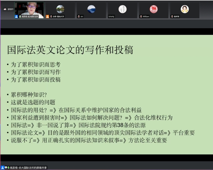 接下来,高圣惕教授分享了撰写英文论文的几点经验。高圣惕教授强调,英文论文的文字句型应精简明白,方法论要掌握扎实,观点展示需明确充分。高圣惕教授在讲座上推荐了两本经典著作,分别是Michael Akehurst的A Modern Introduction to International Law和Richard Gardiner的Treaty Interpretation。