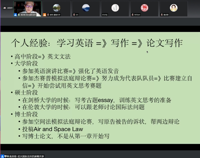 讲座中,高圣惕教授从不同学习阶段分享了自己锻炼使用英文来思维和国际法学术思维形成的艰辛路径。高圣惕教授谈到,他在高中时因为被留级,后来苦学英文文法,大学后找外国朋友每周练习英语即席演讲、才能通过台大法律系的甄选成为系代表队的队员,参加杰赛普模拟法庭辩论赛;硕士阶段为了通过期末考,曾每周思考往届考题而写读书报告、再请英国老师逐字逐句修改;博士阶段再度参加模拟法庭辩论赛,原告被告的诉状都写,培养出自我批评的习惯,努力不懈的写作模式。后来先从撰写单篇期刊论文,开始向前向后发展出不同章节,慢慢形成整本博士论文。在长时间的磨练和坚持基础上,高圣惕教授表示,英文思维的形成并不能速成,鼓励同学们不断强化听、说、读、写的能力。听跟读是吸收的过程,而说跟写是释放的过程。不断练习说跟写,就会知道自己如何不会说跟写。在懊恼之余,养成问题意识,然后阅读好的英文材料,听取标准口音的演说,就可迅速吸收别人的长处,而补足自己不会说以及不会写的短板。