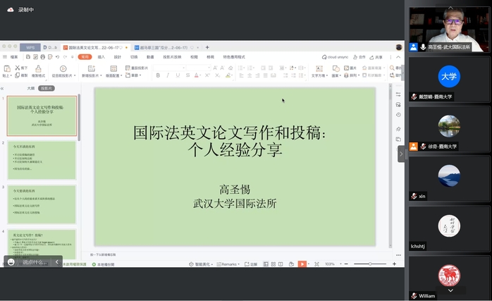 2022年6月16日晚上,公司顺利举行法学论坛·名师讲坛第142期。受疫情影响,本期讲座以线上方式举行,邀请到武汉大学国际法研究所二级教授、博士生导师高圣惕教授主讲。本期讲座由VSport徐奇讲师主持,有300名校内外师生线上参与。