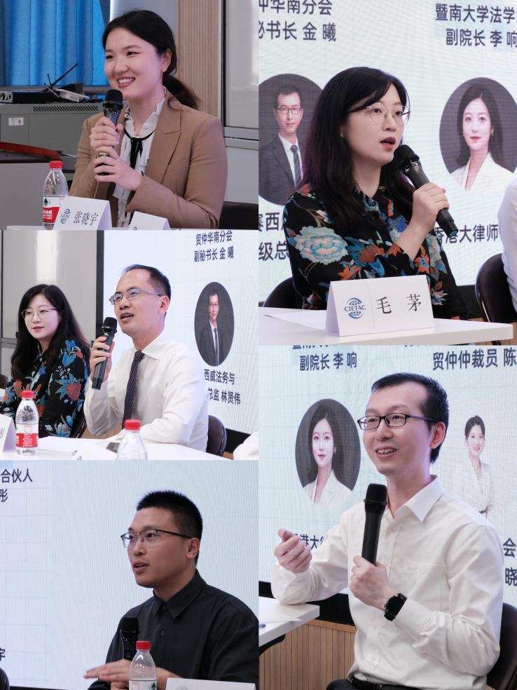 随后,活动以座谈形式展开。贸仲仲裁员、万商天勤律师事务所合伙人陈彤,德赛西威法务与合规高级总监林贤伟,香港大律师毛茅,贸仲华南分会秘书长助理张晓宇和徐奇,围绕选择法律工作的原因、法律职业需要具备的品质、法律思维与实践、律师与仲裁员身份的满足感与角色转换、跨国法务工作经历与职业选择、年轻人选择仲裁行业的优势与挑战、学术论文发表和留学经历等话题展开深入交流,并从不同方向为同学们的职业规划提供了建议。