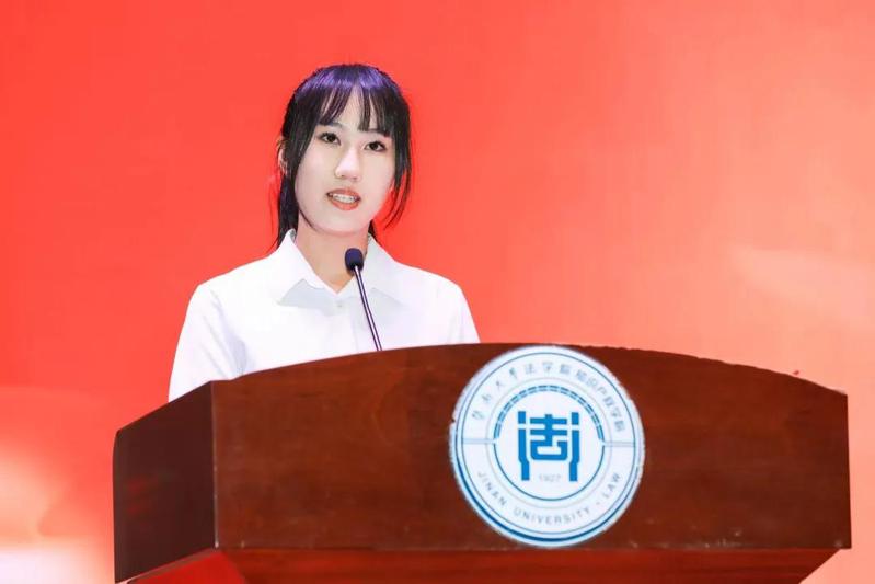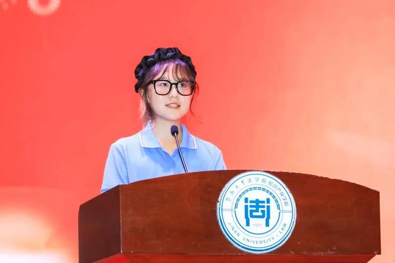 2023级经济法学硕士赖咏薇作为老生代表发言,她鼓励同学们要摆脱冷气,对世界充满好奇与热爱;拒绝傲气,勤勉探究学问之奥秘;胸怀意气,脚踏实地向前冲!2024级知识产权专业本科生安姝仪回顾了入学以来感受到的温暖与关爱,真切地期待在暨南园开启一段充满挑战与机遇的人生旅程。2024级经济法学专业博士研究生詹世富总结了拾阶而上的法律学习生涯,在不同的学习阶段适用不同的学习深度与广度,他鼓励同学们将个人理想融入中国梦的伟大实践中去,为推进全面依法治国贡献自己的青春力量。