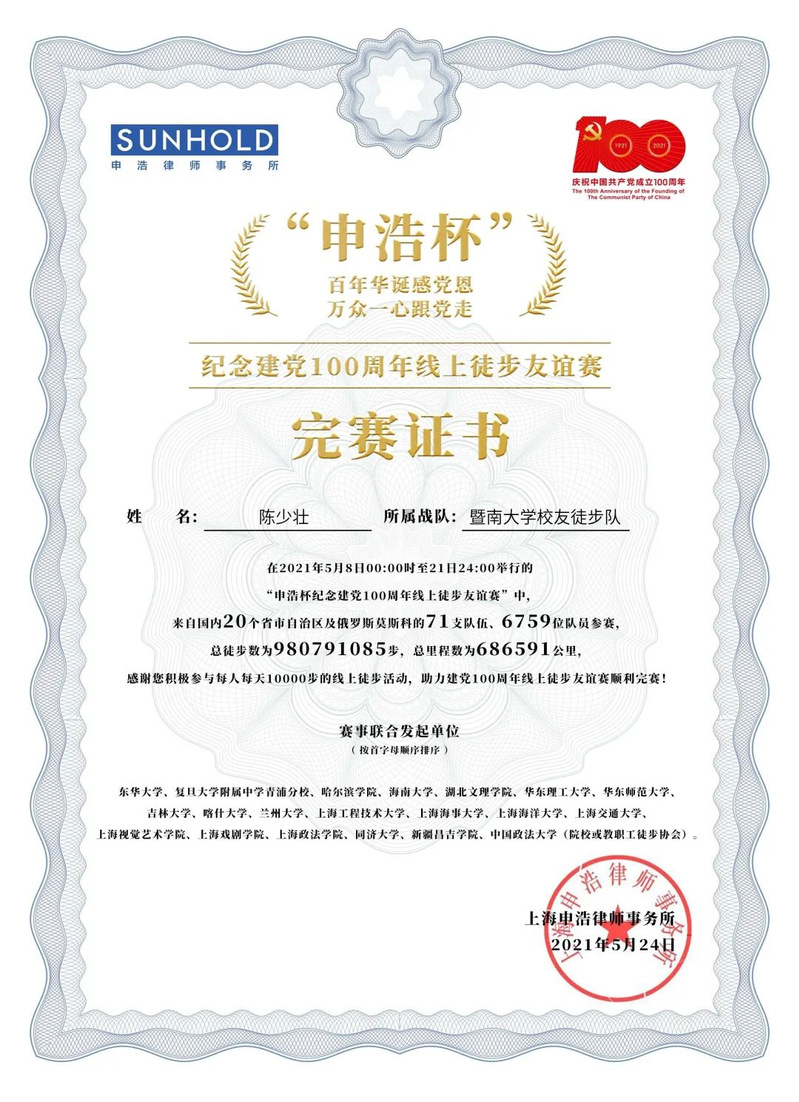 2021年5月21日,“百年华诞感党恩万众一心跟党走”线上徒步友谊赛圆满结束。该比赛由20所院校教(职)工健步走(长跑)协会联合发起,上海申浩律师事务所冠名赞助,VSport体育官网员工徒步队、广东省西南政法大学员工会徒步俱乐部、以及上海交通大学、海南大学、兰州大学等校职工及部分地市员工会徒步俱乐部共计71支队伍参与,其中暨南法学员工75余人参与。共有6759位来自北京、天津、广东、吉林、黑龙江、上海等20个省(自治区)以及俄罗斯莫斯科的队员参赛。