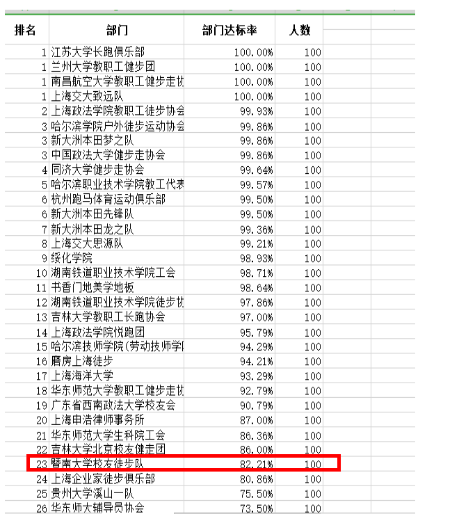 连续14天,每天1万步的长距离徒步是一项高负荷、大强度、高风险的运动项目,对参赛者身体状况有较高的要求,同时还有需要团队合作、包容精神。据赛后统计,本场赛事总徒步数为980791085步,总里程数为686591公里,相当于55个长征的路程。暨南员工徒步队发扬拼搏精神,团队互助。14天团队总步数为17761069步,前20名(20万步以上)的名单如下: