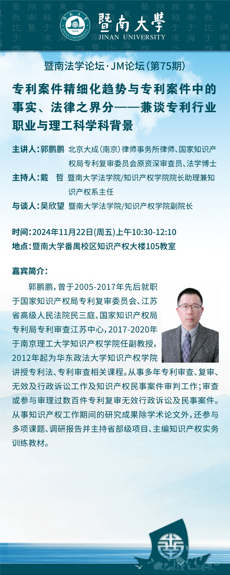 暨南法学论坛·JM讲坛(第75期)| 专利案件精细化趋势与专利案件中的事实、法律之界分——兼谈专利行业职业与理工科学科背景